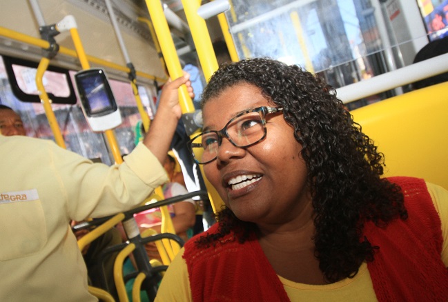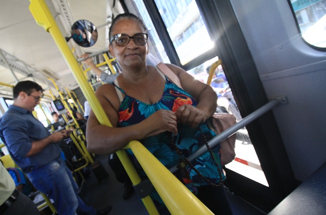 Danusa, que tem problema no quadril, classifica ônibus como confortável para quem tem alguma limitação física (Foto: Mauro Akin Nassor/CORREIO)